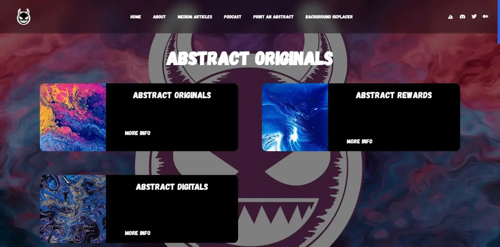 An NFT website for brand abstract originals with e-store and background-remover tool. Using NextJS, Tailwind CSS, Printful, Snipcart.